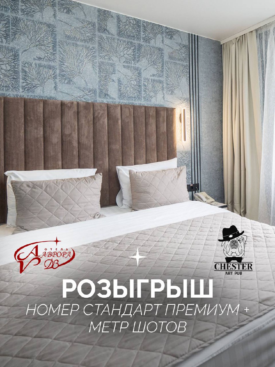 ✔️ быть подписанным на отель Аврора и Chester Art Pub