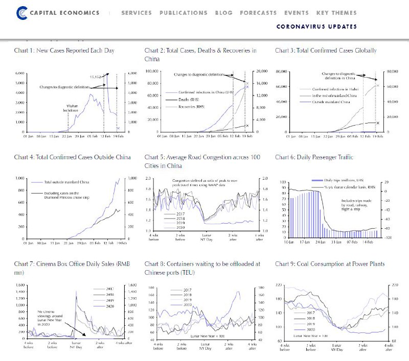 Пожалуй один из лучших (открытых) источников для мониторинга ситуации с распространением вируса в Китае и его влияния на экономику - набор графиков от Capital Economics. Большинство из них основаны на ежедневных данных, которые обновляются каждый рабочий день.👍