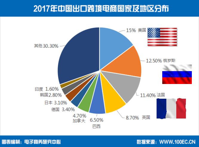 А теперь посмотрим на данные, которые публикуются с китайской стороны. Согласно отчету Китайского центра исселедований интернет-торговли (China E-commerce Research Center, CECRC), по итогам 2017 года объем экспорта трансграничной электронной торговли КНР составил 6,3 трлн. юаней (то есть примерно 930 млрд. долл.). При этом китайский центр приводит данные о страновой структуре экспорта, согласно которым Россия🇷🇺 находится на втором месте после США🇺🇸 по объему покупок в китайских интернет-магазинах - 12,5% против 15% у США.