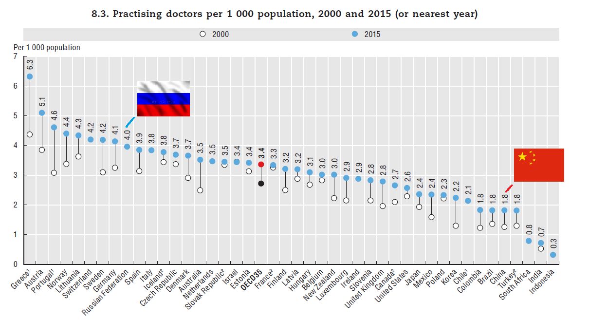 📺 Доклад ОЭСР Health at a Glance 2017: по количеству докторов на душу населения Китай находится на уровне Колумбии, Бразилии и Турции