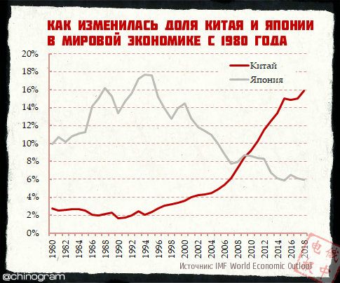 FT пишет, что доля Китая в мировой экономике достигла критической отметки 18%. Почему эта цифра является такой важной: напоминают, что эта отметка оказалась потолком и для Советского Союза, и для Японии, которые в свое время также пугали Запад опережающими темпами экономического развития.