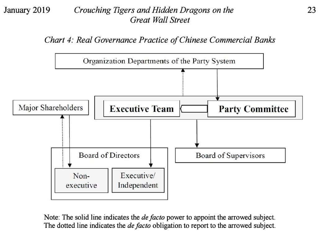 В действительности, однако, китайскому государству удается сохранять контроль над коммерческими банками Китая, путем концентрации большинства реальных полномочий в руках исполнительной команды (executive team), а также через систему назначений и вознаграждения и за счет разделения функций собственности и контроля. Механизмы внешнего управления, такие как рыночная конкуренция, банковское регулирование и надзор, а также враждебные поглощения, недостаточны для того, чтобы наложить эффективное ограничение на китайское партийное государство.