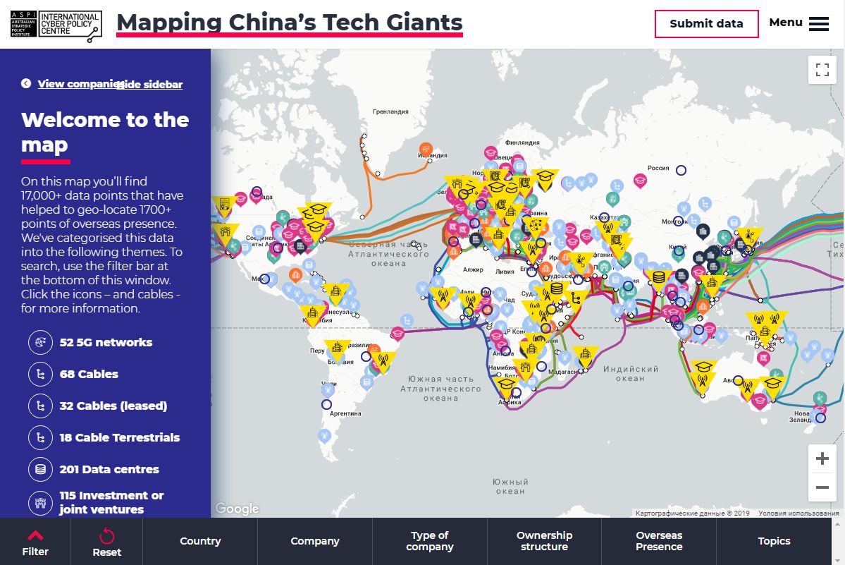 Исследователи из Australian Strategic Policy Institute создали базу данных о международной экспансии китайских технологичных компаний Mapping China's Tech Giants👏👏👏