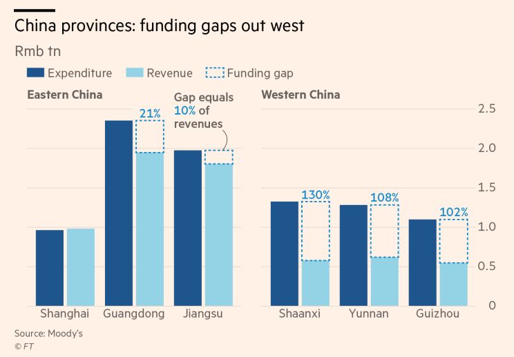 Financial Times иронично советует международным инвесторам не путать между собой соседние провинции Шаньси (山西) и Шэньси (陕西). Названия двух регионов созвучны, а вот разница в показателях бюджетной обеспеченности огромна: в провинции Шаньси расходы превышают доходы бюджета на 20%, а в Шэньси - на целых 130%🤑🤑🤑.