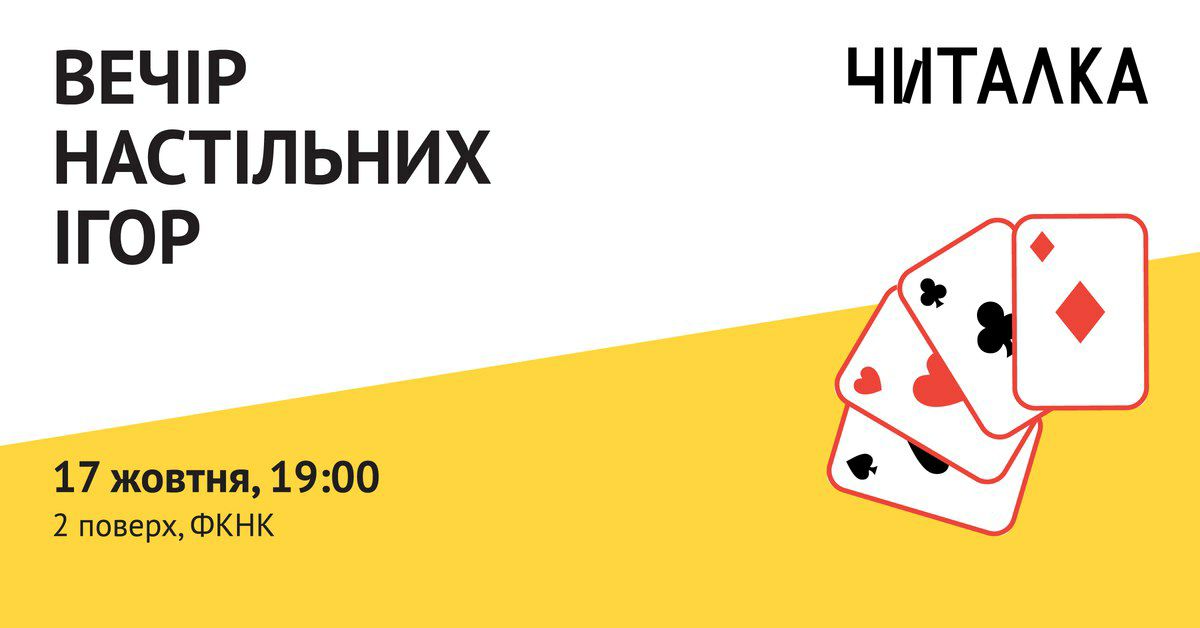 Ви вже встигли втомитись за цей навчальний рік? Чи відчували ви, що з кожним днем у вас все менше і менше бажання слухати про нейронні мережі, С++ та інші високі матерії після пар? Тоді у нас для вас є просто найчудовіша новина! У четвер, 17 жовтня, у Читалці буде проводитися вечір настільних ігор!