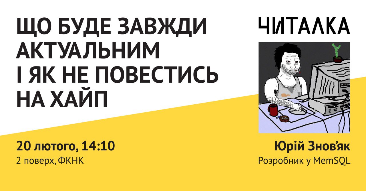 Цього четверга до нас завітає Юрій Знов’як з суперкорисною для молодого спеціаліста лекцією. Досвіду Юри можна позаздрити - після абсолютного результату на міжнародній олімпіаді з інформатики та двох участей у фіналі ACM ICPC він працював у Facebook та Google, однак 15-го року повернувся до України і нині працює розробником у київському офісі MemSQL.
