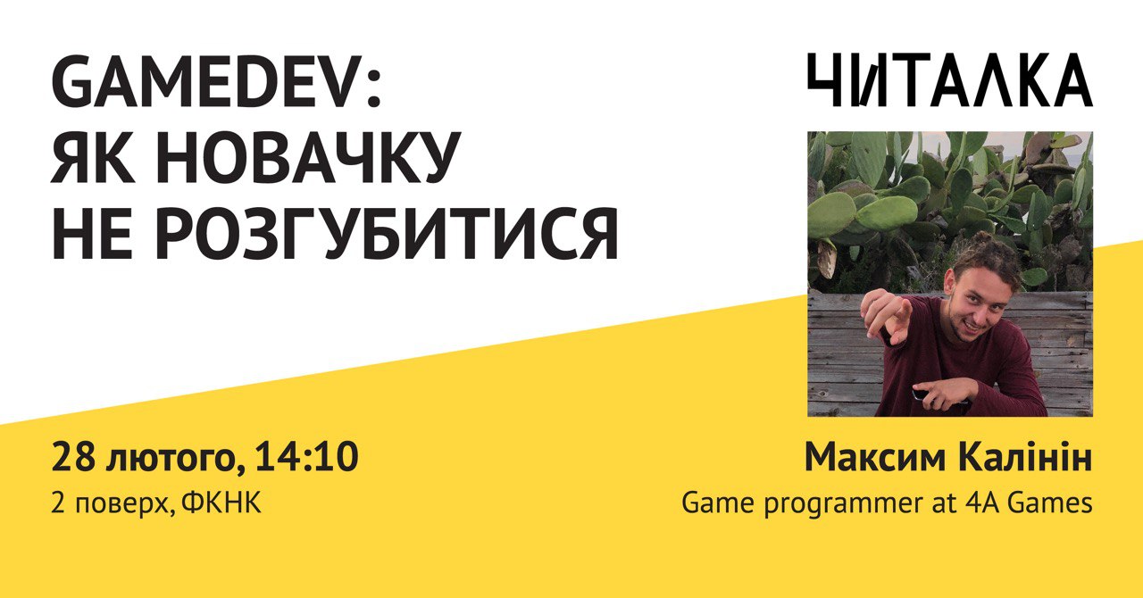 Мрієш не тільки ходити по чужим ігровим світам, а і творити власні? Тоді приходь 28 лютого на лекцію Максима Калініна — випускника нашого факультету. Хлопець вже більше 4 років працює у компанії 4А Games і з власного досвіду розкаже про напрямки програмування у розробці ігор (а їх не один і не два!), повідає про болючі теми для GameDev’а. Крім того, Максим розповість про альтернативні ролі у створенні ігор: гейм-дизайнера, QA, аніматора. Інформація буде однаково корисною і цікавою як для тих хто хоче займатись GameDev, але не знає до чого готуватись, так і для тих, хто ще не обрав напрямок, в якому бажає розвиватись.
