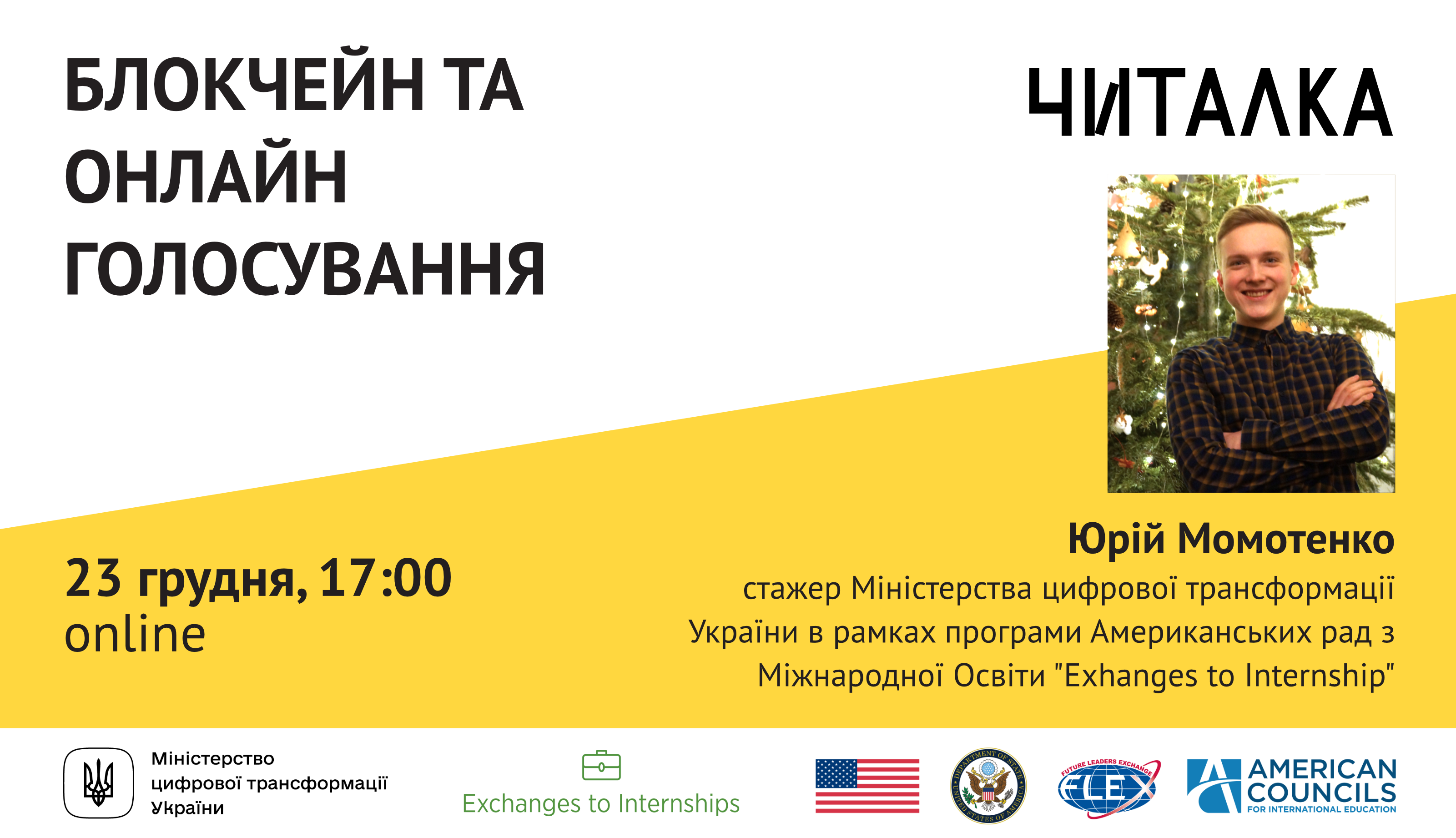 23 грудня о 17:00 відбудеться лекція на тему "Блокчейн та онлайн голосування" від Юрія Момотенка. Хлопець навчається на третьому курсі спеціальності "Програмна Інженерія" факультету комп'ютерних наук і кібернетики і зараз проходить стажування в Міністерстві цифрової трансформації України.