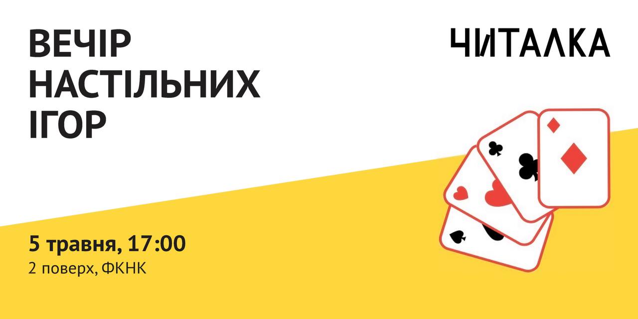 Чекатимемо на тебе в п‘ятницю 5.05 о 17 годині в Читалці. Гратимемо в усе: починаючи від абсолютної класики на кшталт Мафії та закінчуючи принесеними тобою ж іграми на власний смак.