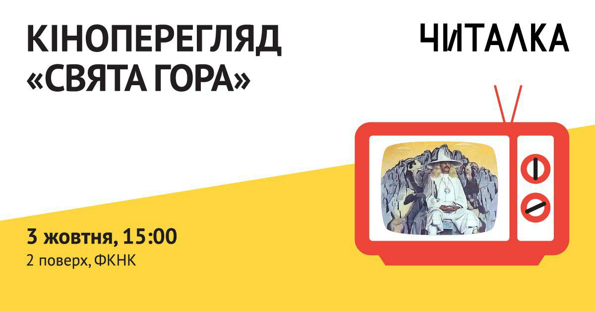 Лекції лекціями, але відпочивати теж треба! Запрошуємо вас на перегляд мексиканської сюрреалістичної фантастики (ми самі в шоці від такого опису!!) Алехандро Ходоровскі "Свята Гора". Як кажуть про кіно самі організатори, Кінопокази на Кубі, "Воно буквально психоделічне - сприймайте це як попередження та інтригу". Гарний спосіб відпочити після важких 4 днів навчання. Чекаємо на вас у "Читалці", 3 жовтня о 15:00. ☺️