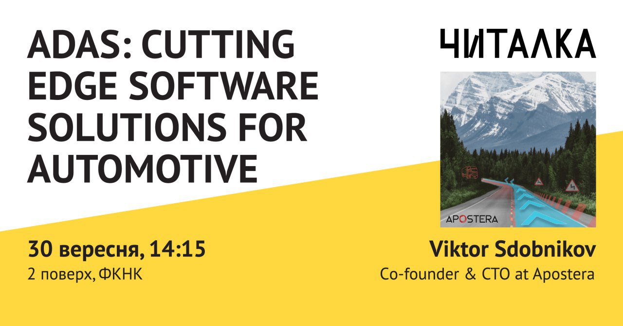 Компанія Apostera займається розробкою просунутих систем допомоги водієві (ADAS), і саме про цей напрямок розвитку ви дізнаєтесь с перших вуст - співзасновник та CTO Віктор Сдобніков вже у понеділок (30 вересня) о 14:15 завітає до нашої Читалки з цією суперцікавю темою для розповіді 😱