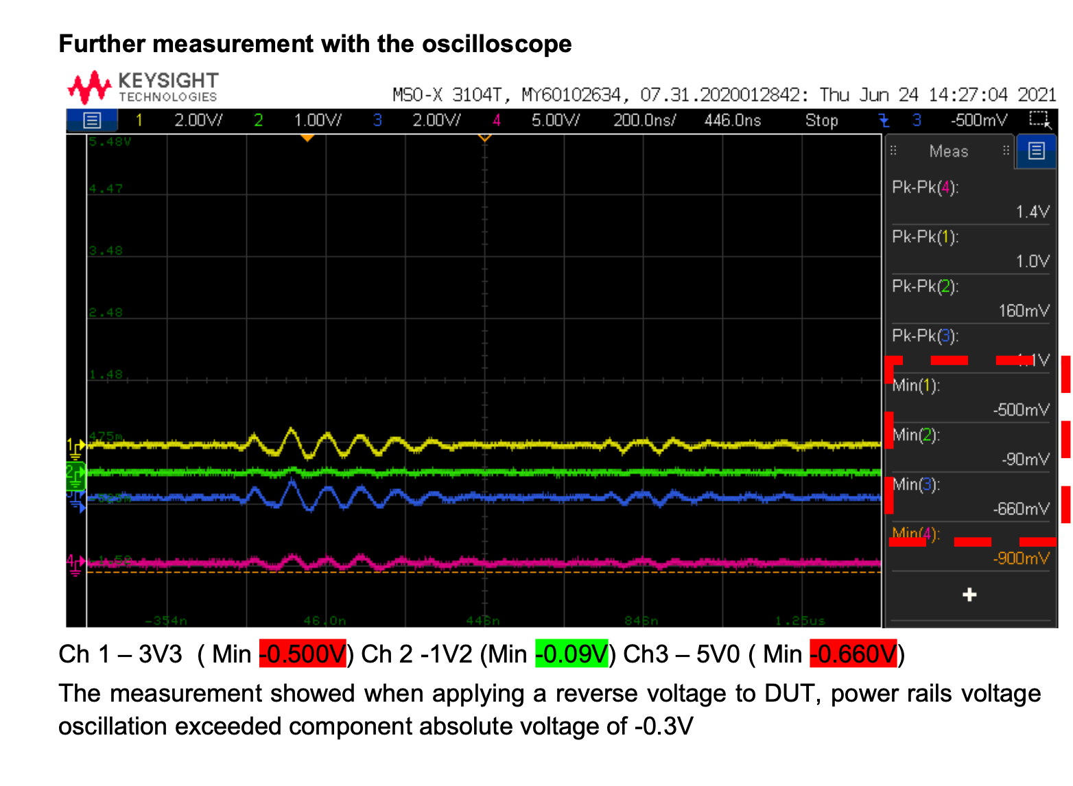 В ходе наладки инженер производителя обнаружил странное: при переплюсовке (а это один из тестов) напряжение на шинах питания устройства, во-первых, звенело, а во-вторых — превышало максимальные уровни, допустимые потребителями. Например, на выходе 3.3В преобразователя было −0.46В, тогда как допустимое значение у большинства микросхем в системе −0.3В.