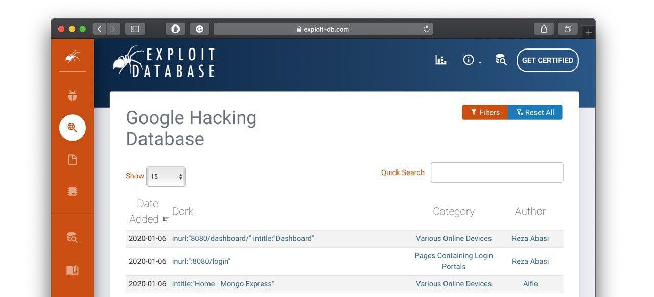 Google Hacking Database - самая популярная база поисковых запросов, которая ежедневно пополняется пользователями. Здесь авторы публикуют готовые запросы для google, которые помогут вам найти эксплоиты.