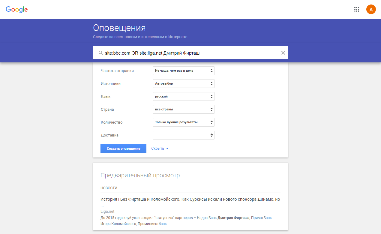 В прикрепленной картинке для примера мы выбрали запрос site:bbc.com OR site:liga.net Дмитрий Фирташ - Google будет искать упоминания о Дмитрие Фирташе на сайтах bbc.com или liga.net. Используйте “умные” комбинации ключевых слов и операторы поиска, чтобы получить релевантные результаты: