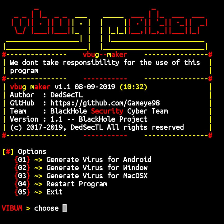 vbug - инструмент для быстрого создания вирусов, имеющий возможность выбрать между тремя типами вирусов: Anvima - для Android, WinVima - для Windows и MACvima - для MACOS.