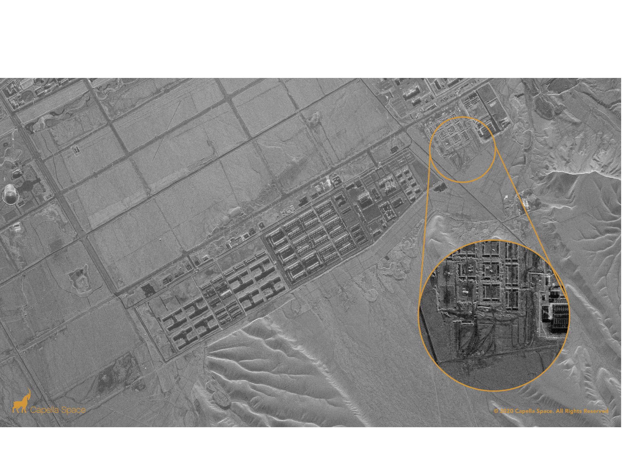 На изображении: Лагеря перевоспитания в Синьцзяне для принудительного содержания уйгуров и других граждан Китая, исповедующих ислам. Снимок Capella Space.