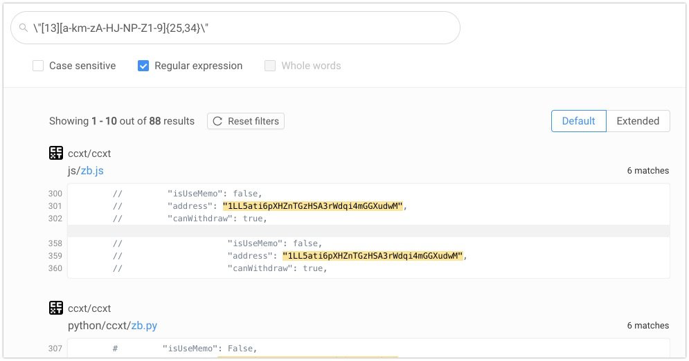 На изображении: Поиск адреса биткоин в //grep.app с помощью регулярных выражений