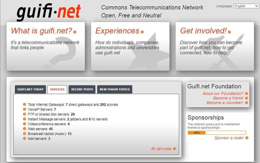guifi.net — децентрализованная Р2Р сеть, использующая Wi-Fi/Bluetooth для связи. Guifi включает в себя 37 000 рабочих нод. Покрытие сети составляет 70 259 километров. «Начинку» сети можно наблюдать на скрине.