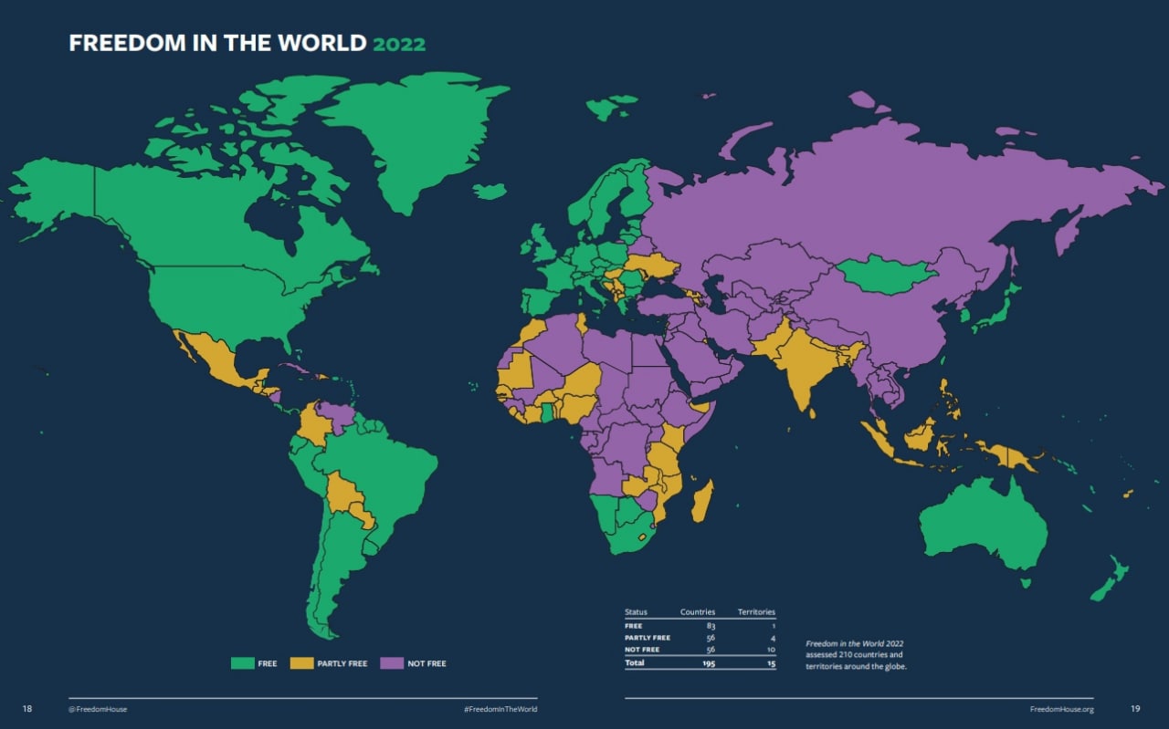 Карта Индекса свободы из отчета "Freedom in the World 2022"
