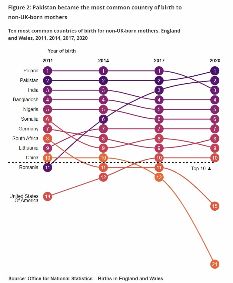 10 наиболее распространенных стран рождения у матерей, не родившихся в Великобритании, Англия и Уэльс (2011-2020).
