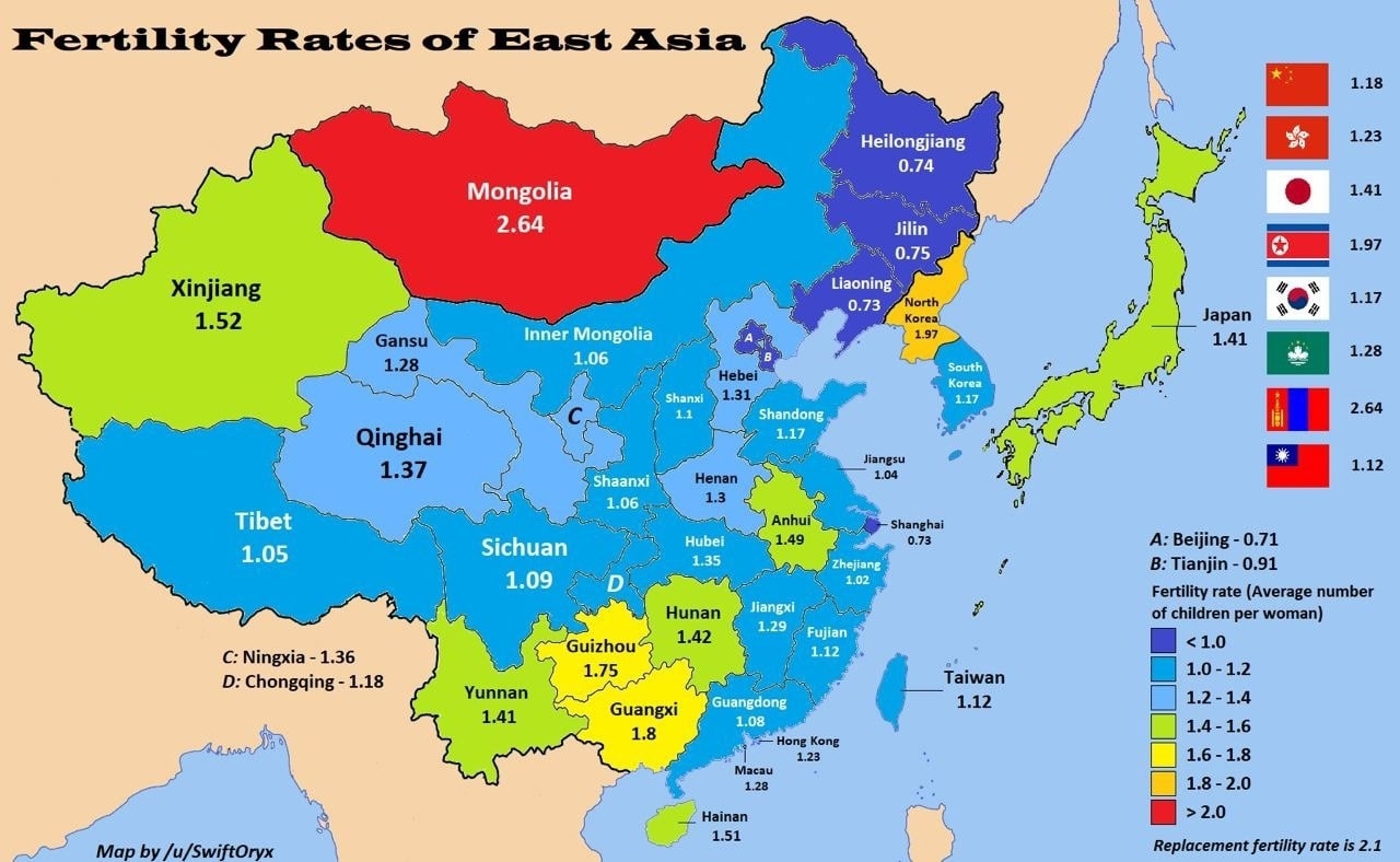 Уровень воспроизводства (2,1 ребёнка на женщину) достигает только Монголия.