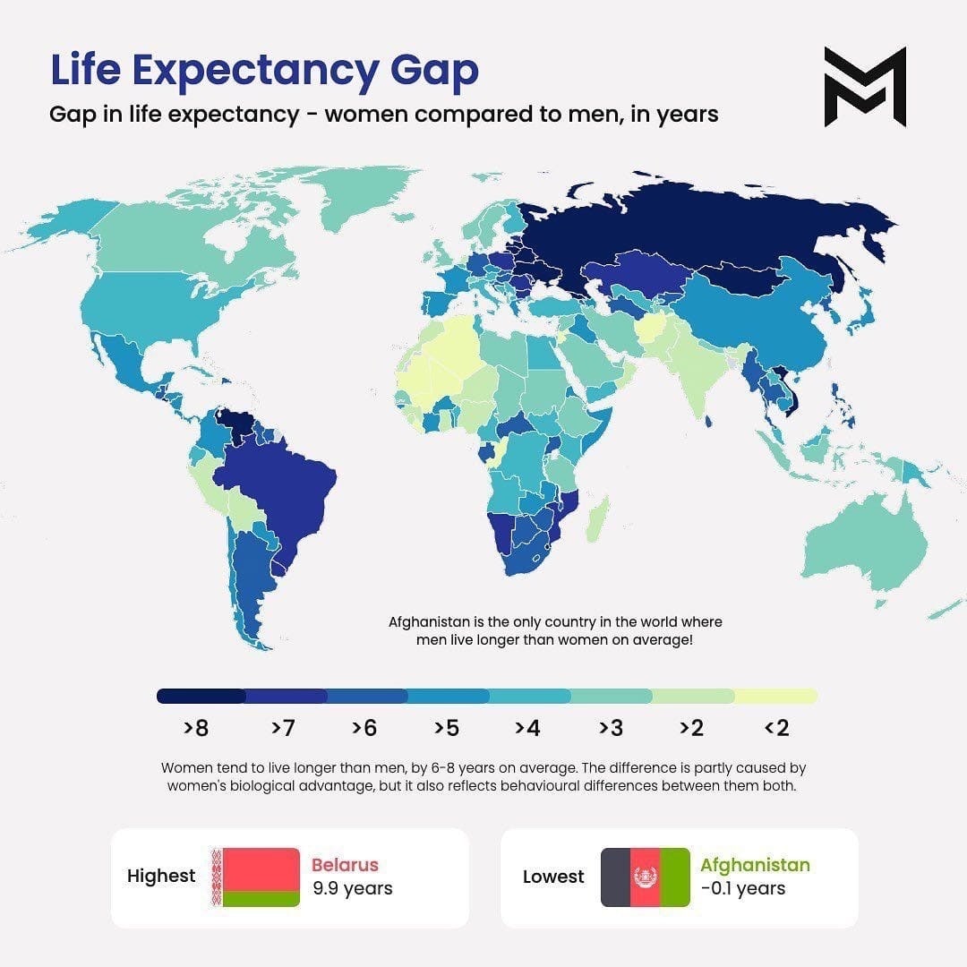 Разрыв продолжительности жизни между мужчинами и женщинами в разных странах