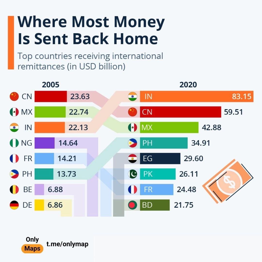 Крупнейшие страны, получающие международные денежные переводы (в миллиардах долларов США)
