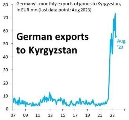 Экспорт Германии в Кыргызстан в этом году вырос в 14 раз. Естественно, что это параллельный импорт для РФ. Европейские санкции просто делают товары из Европы существенно дороже для россиян.