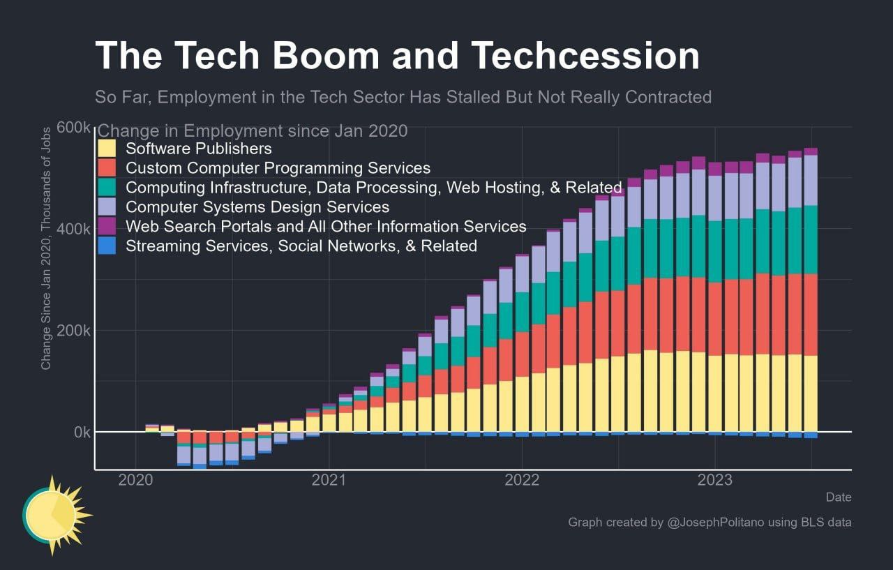 Занятость в сфере технологий в США снова растёт, хотя и намного медленнее, чем в 2021/2022 годах - количество рабочих мест выросло в оба последних месяца.