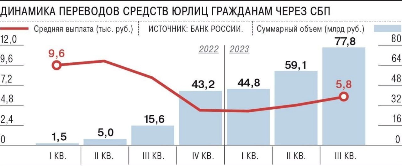 Динамика среднего перевода по СБП и общий объем переводов денежных средств через данную систему по кварталам.