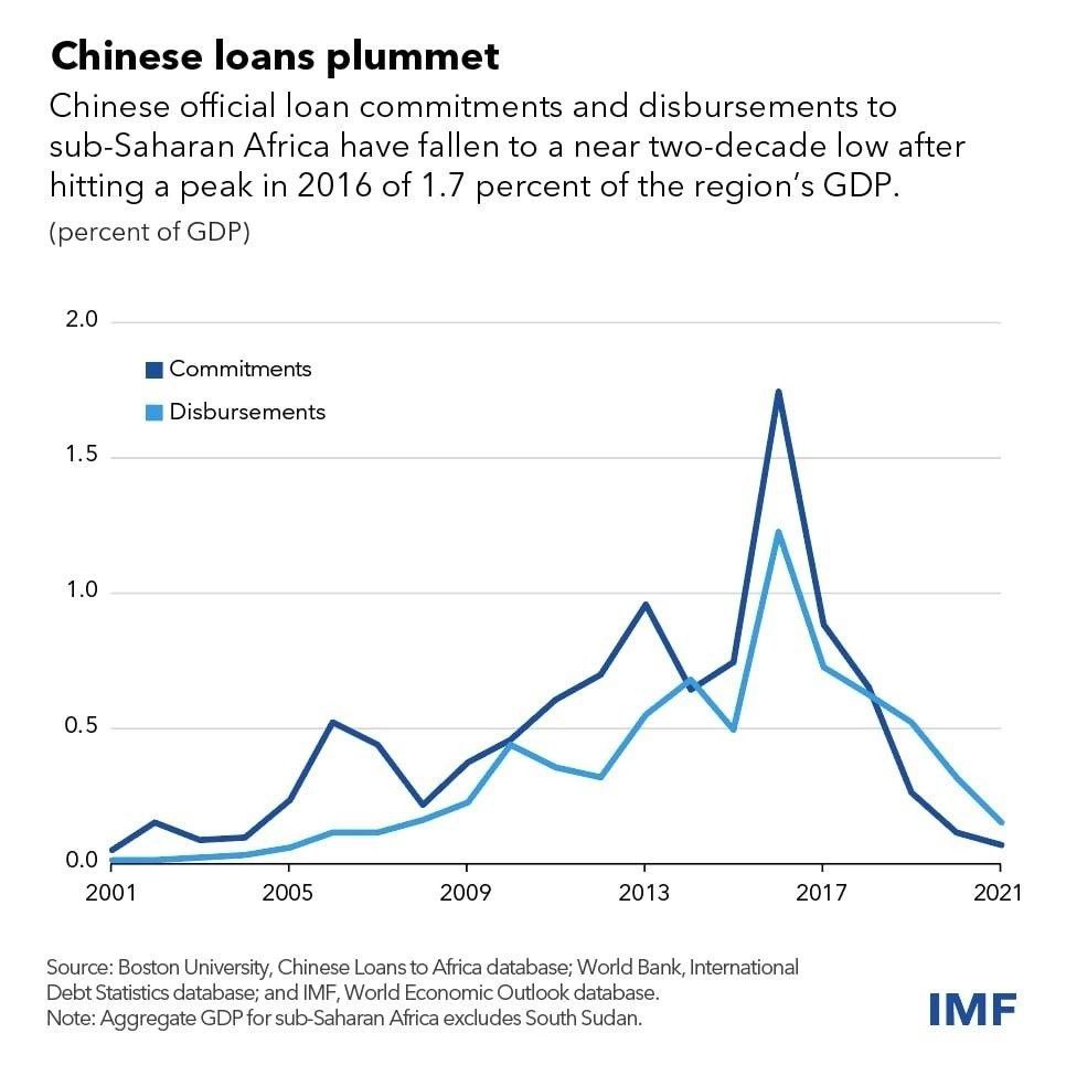 Кредиты Китая странам Африки к югу от Сахары упали до минимума за два десятилетия к 2021 году (и продолжают падать в 2022-23 годах).