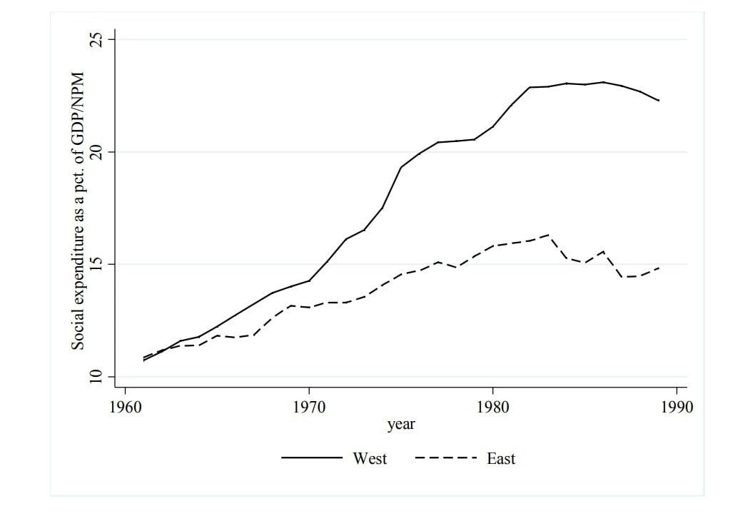 С 1970-х гг. западные страны значительно опережали соцлагерь по доле расходов на социальные нужды в ВВП (правда, на графике не учтены расходы на образование и на субсидирование цен на потребительские товары). По расходам на душу населения преимущество, разумеется, и ранее было на стороне Запада.