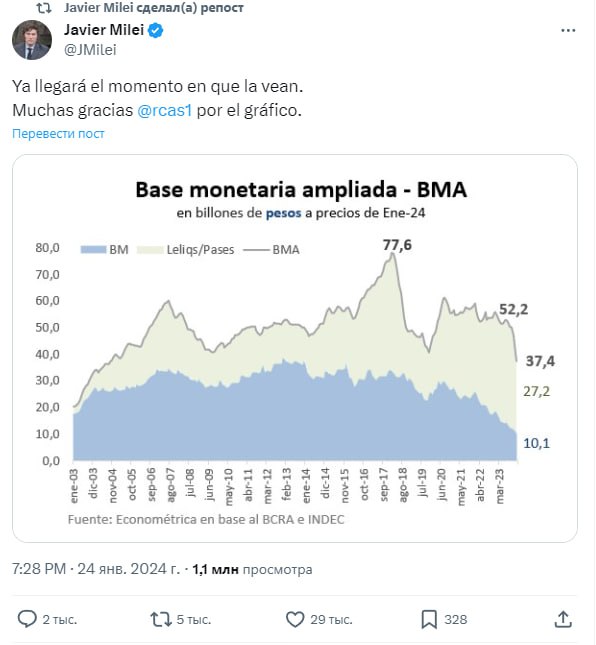 🇦🇷 Хавьер Милей похвастался сокращением денежной массы аргентинского песо с 52 до 37 миллиардов долларов. Таким образом президент-либертарианец борется с гиперинфляцией, достигшей в прошлом году 211,4%.