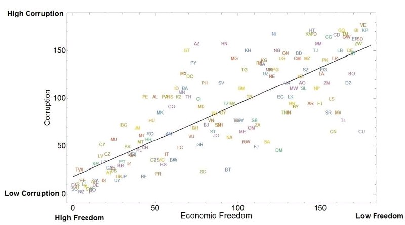 Вот график, координаты которого экономическая свобода (The Heritage Foundation Index of Economic Freedom 2023) и коррупция (Corruption Perceptions Index 2020-2022). Страны на графике обозначены их доменными именами.