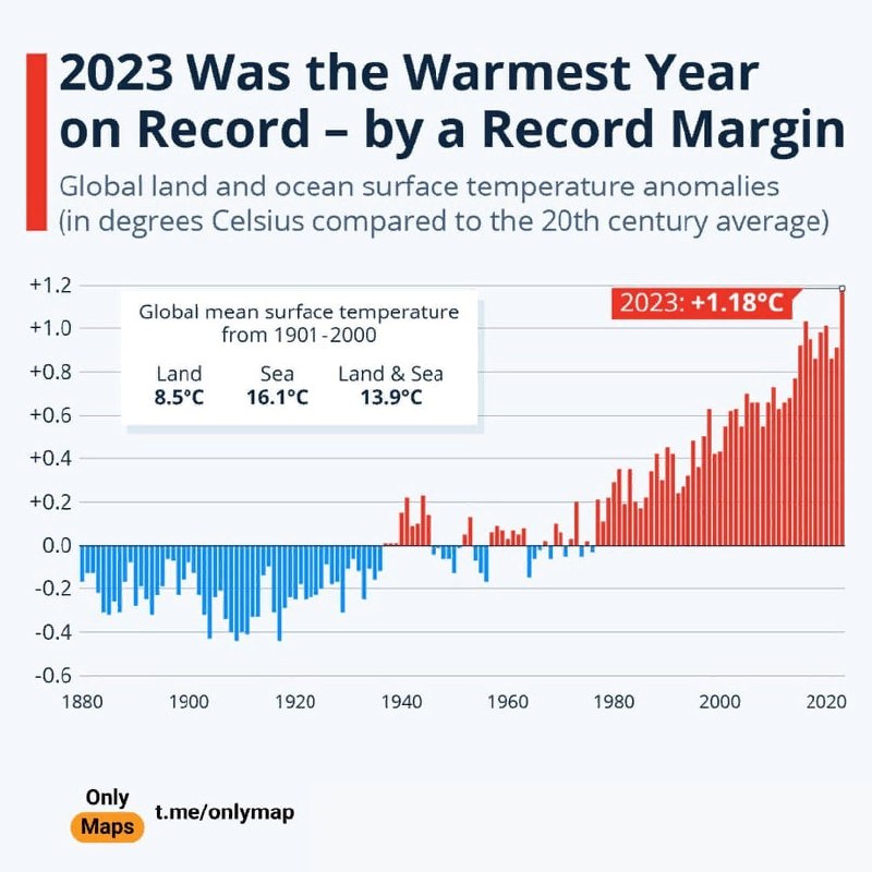 2023 год стал самым теплым годом за всю историю наблюдений - с рекордным отрывом