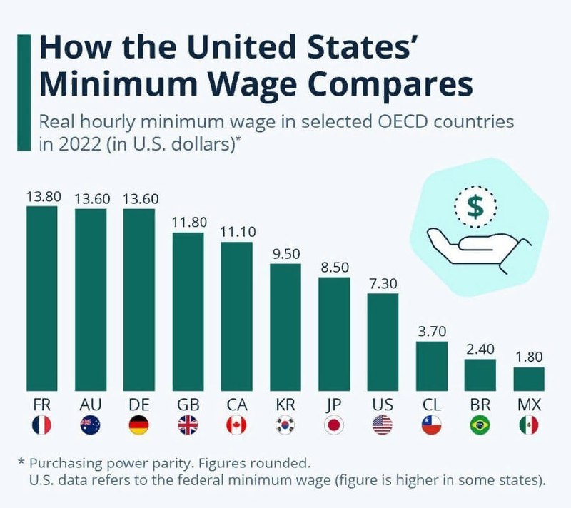 Реальная почасовая минимальная заработная плата в отдельных странах ОЭСР в 2022 году, в $
