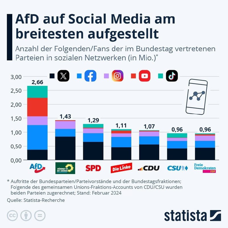 Консерваторы имеют в совокупности 2,66 миллиона подписчиков и абсолютную доминацию на Youtube и TikTok: у AfD подписчиков на этих платформах больше, чем имеют все остальные партии вместе взятые. А вот в X (бывш. Twitter) ситуация обратная.