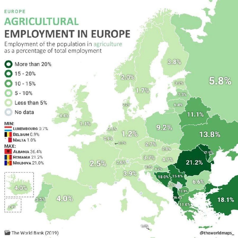 Занятость в агросекторе по Европе, данные на 2019 год. По этому показателю Россия приближается к среднеразвитым странам Европы вроде Испании и Португалии. И по мере модернизации и роста производительности труда сельхозсектор России и дальше будет уменьшать занятость – это экономическая аксиома. Такая же аксиома: основной работодатель сегодня – сфера услуг.