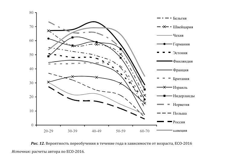 «Россия имеет самый низкий показатель охвата среди всех стран, представленных на графике. Безусловная вероятность переобучения в России максимальна в самых младших группах, где она составляет около 28%, и постепенно снижается до 3-5% в самых старших возрастных группах. Особо отметим случай скандинавских стран. Здесь не только сами масштабы охвата во всех возрастах довольно высокие, но и максимум в 70% наблюдается в группе 40-49 лет. Каждый работающий в этих странах, достигший предпенсионного возраста, переобучается примерно раз в два года. Каждый работающий немец в предпенсионном возрасте будет переобучаться примерно раз в три года».