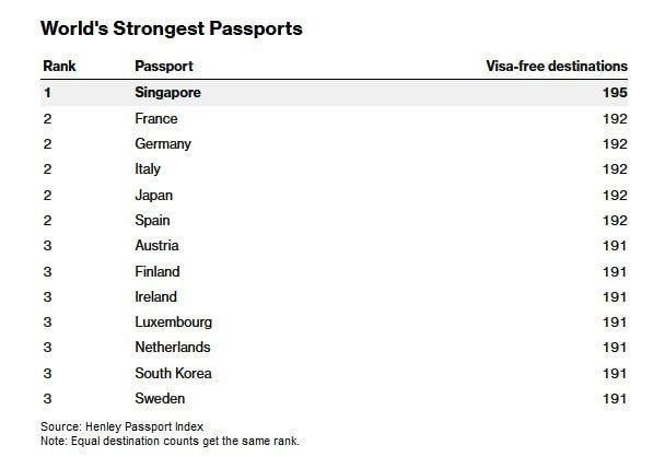 Наличие паспорта Сингапура означает возможность безвизового въезда в рекордные 195 стран мира, что ставит город-государство на первое место в рейтинге Henley Passport Index.