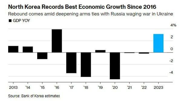 ВВП Северной Кореи в 2023 году вырос на 3,1% по сравнению с годом ранее, положив конец трехлетней полосе сокращения и показав самый большой рост с 2016 года, согласно оценкам Центрального банка Южной Кореи.