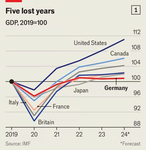 Германия выделяется отстающими экономическими показателями среди стран G7. Промышленное производство упало (особенно в энергоёмких секторах), автопроизводители испытывают трудности, рынок жилья вошёл в кризис. Низкий рост в Китае и Европе, а также разрыв связей с России нанесли ущерб экспорту, и перспективы быстрого улучшения выглядят печально. Дополнительно Германия сейчас вынуждена увеличивать оборонные траты.