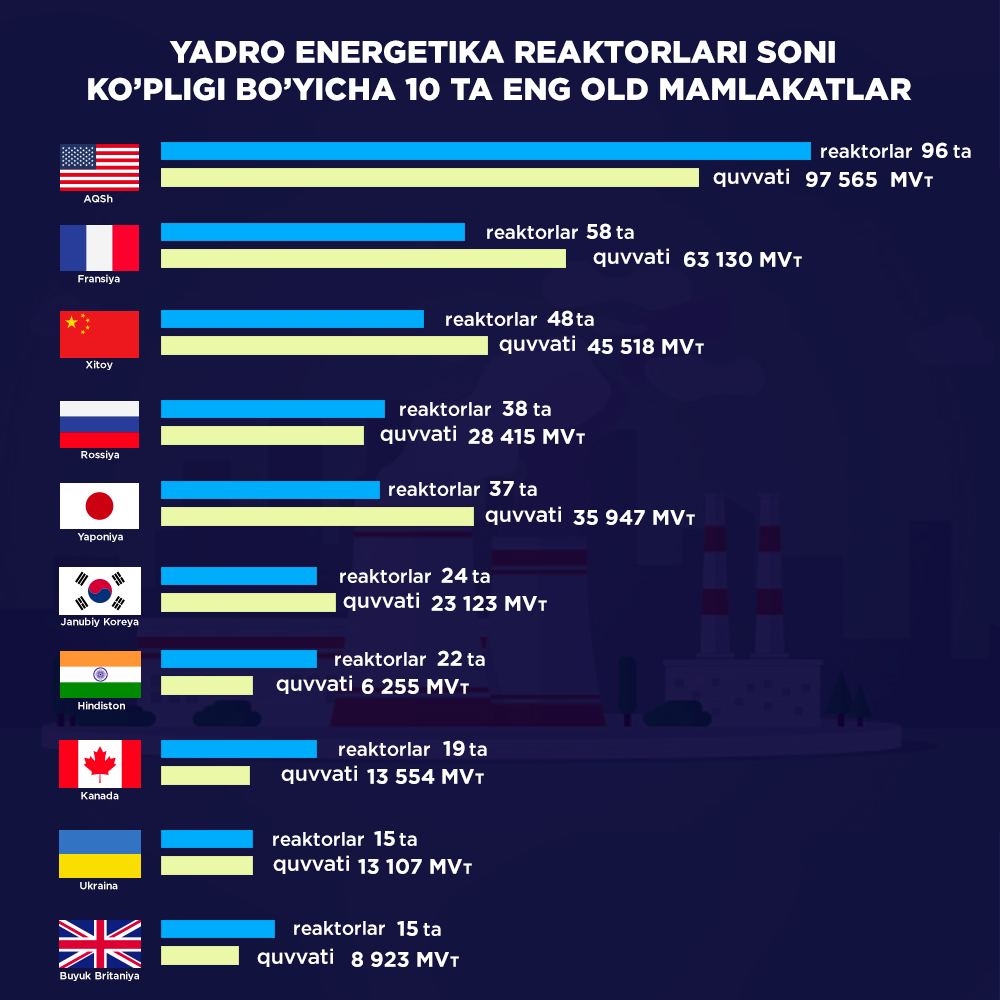 Дунё бўйлаб нечта ядро энергетика реакторлари атом электр станциялари қуввати ҳисобига ишлайди? Бу рўйхат тўлиқ эмас, бироқ рақамларга қараганда, уларнинг сони анчагина. (или анчагинани ташкил этади.)