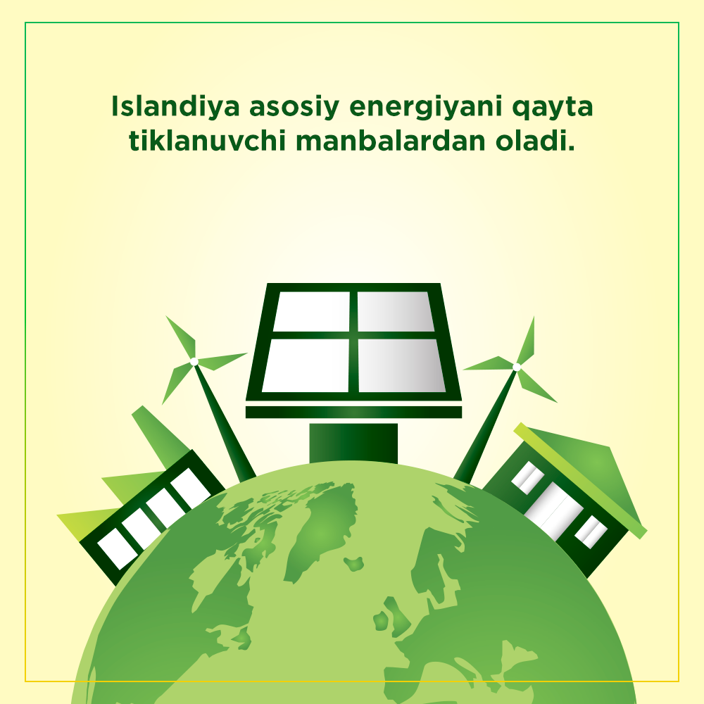 Аҳолиси 357.050 нафар одамни ташкил этувчи Исландияда 80% энергия қайта тикланувчи манбалар ҳисобига ҳосил қилинади. Шундан музликлар ва улардан оқиб чиқувчи тошқин дарёлар эвазига 75%и гидроэнергетикага тўғри келади, геотермал манбалар эса 25% энергияни ишлаб чиқаради.