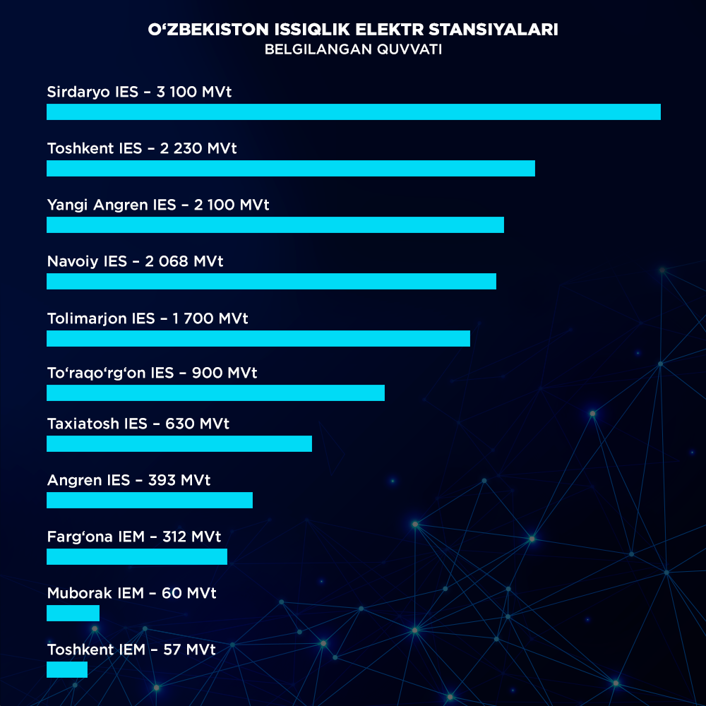 Ўзбекистон электр станцияларига бағишланган маълумотлар узатишда давом этамиз. Иссиқлик электр станциялари қуввати.