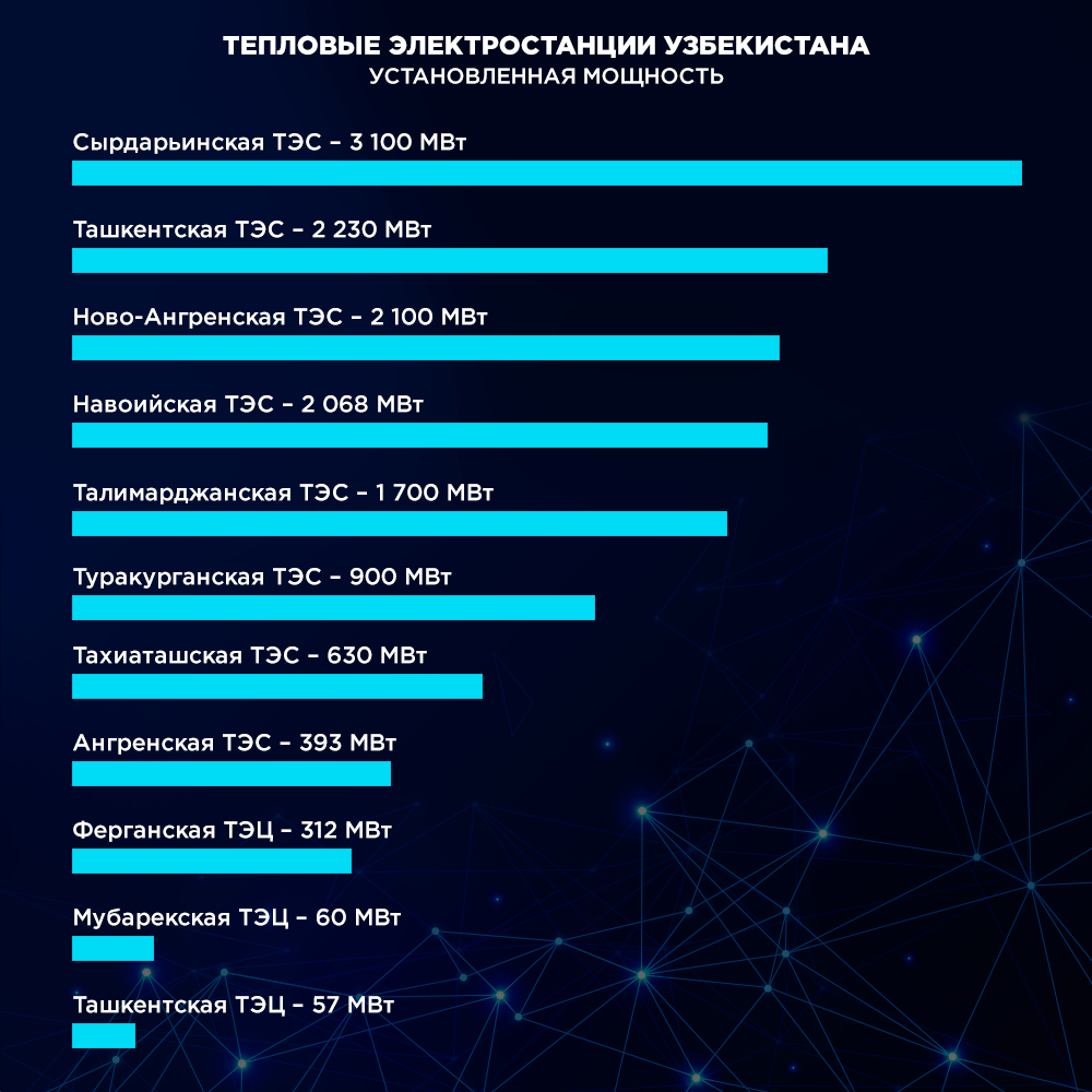 Продолжаем серию публикаций, посвященных электростанциям Узбекистана. Мощности тепловых электростанций.