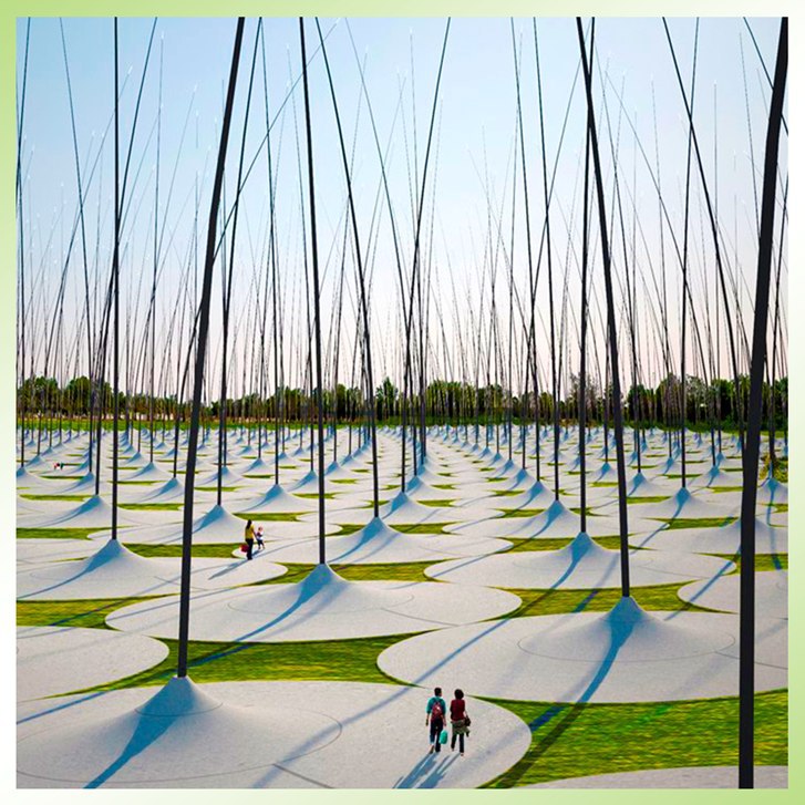 1203 стебля из углеродистого волокна, каждый около 55 метров высотой, с бетонными основаниями шириной по 20 метров, будут установлены на расстоянии 10 метров между собой.