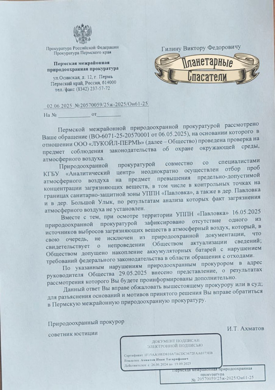 02.06.2025 Пермская межрайонная природоохранная прокуратура ответила на наше обращение по поводу отравленного воздуха в деревнях Павловка и Большой Улык.