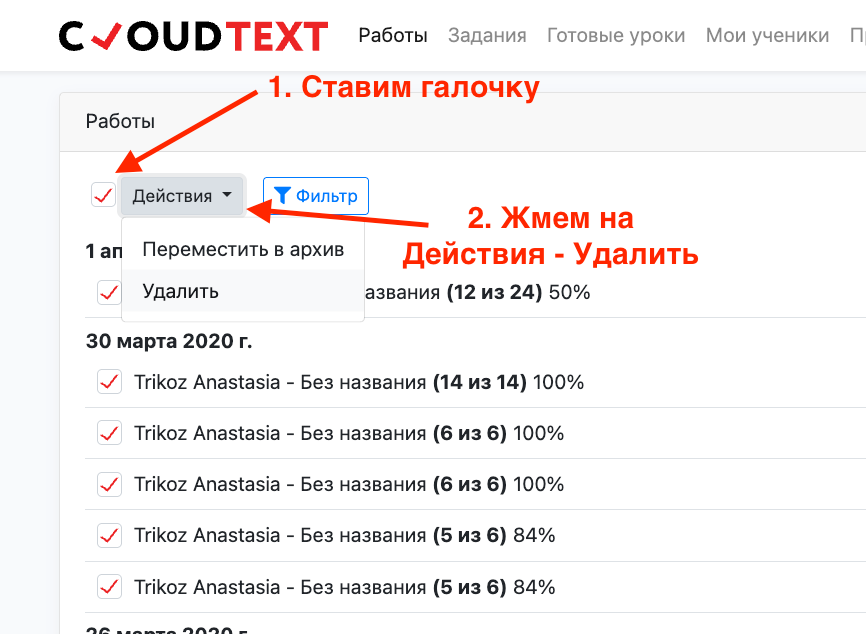 И вот, говоря про инвентаризацию, про порядок, что я вам рекомендую: вы можете самостоятельно удалить старые работы учеников в ваших "кладовочках". Вчера мы сделали так, чтобы в разделе "работы" отображалось по 50 строк, а не 15, как это было раньше. И теперь вы можете достаточно быстро избавиться от ненужного.