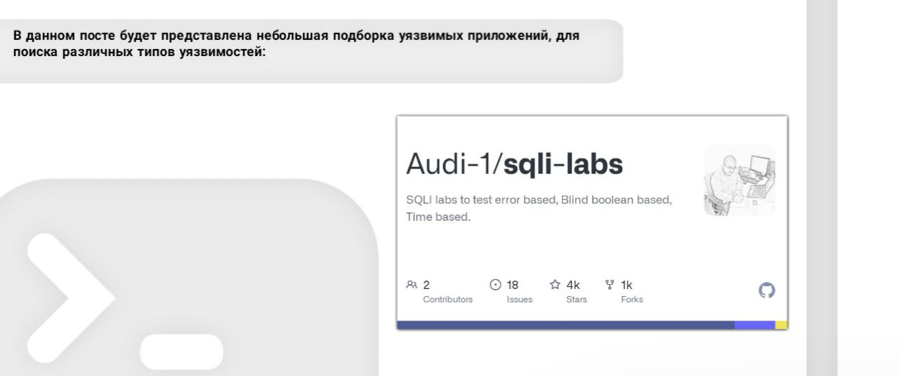 В данном посте будет представлена небольшая подборка уязвимых приложений, для поиска различных типов уязвимостей: